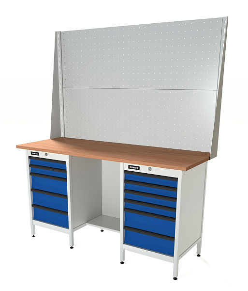 Верстак серии Standart, 1600 мм, фанера, тумба с 5-ю ящиками + тумба с 6-ю ящиками, экран 1000, синий (светло-серый) RAL, RUNTEC, RTS16F-TS5-TS6-P16-P16-5005(7035)