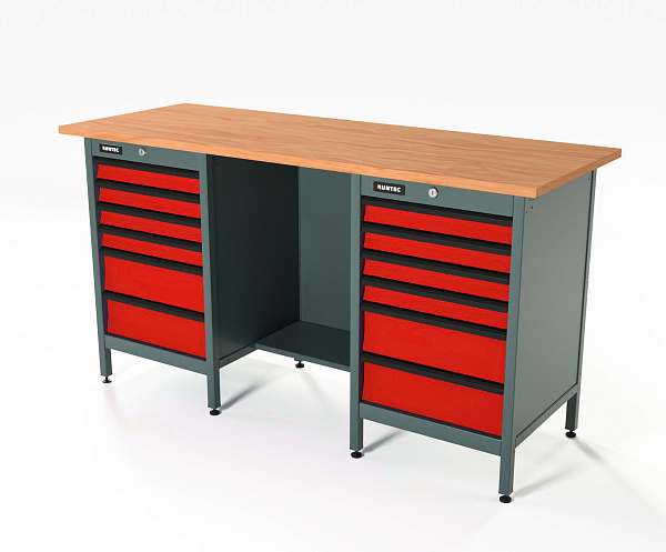 Верстак серии Standart, 1600 мм, фанера, тумба с 6-ю ящиками + тумба с 6-ю ящиками, красный RAL 3020