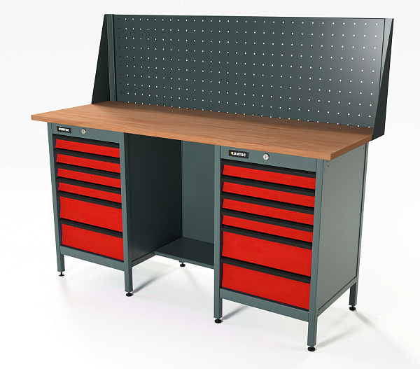 Верстак серии Standart, 1600 мм, фанера, тумба с 6-ю ящиками + тумба с 6-ю ящиками, экран 500, красный RAL 3020, RUNTEC, RTS16F-TS6-TS6-P16-3020