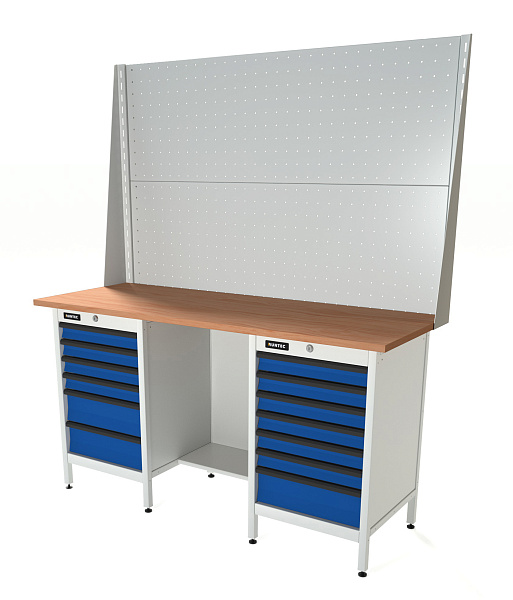 Верстак серии Standart, 1600 мм, фанера, тумба с 6-ю ящиками + тумба с 7-ю ящиками, экран 1000, синий (светло-серый) RAL, RUNTEC, RTS16F-TS6-TS7-P16-P16-5005(7035)