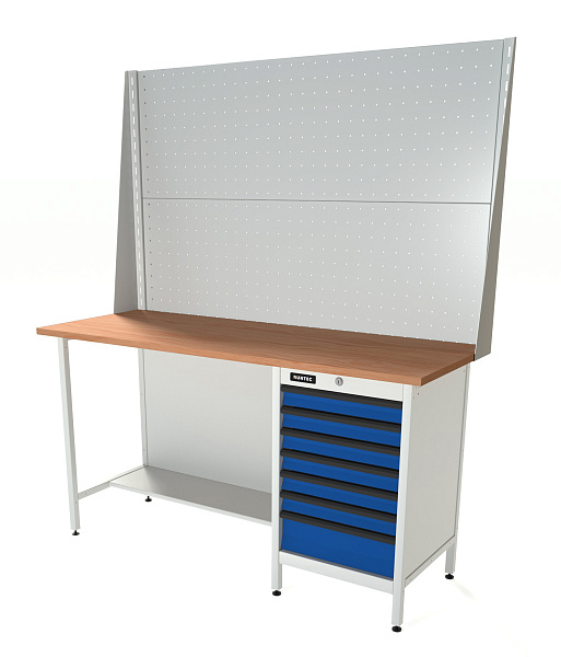 Верстак серии Standart, 1600 мм, фанера, тумба с 7-ю ящиками, экран 1000, синий (светло-серый) RAL 5005 (7035)