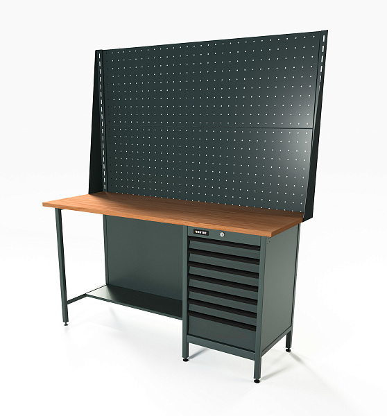 Верстак серии Standart, 1600 мм, фанера, тумба с 7-ю ящиками, экран 1000, серый RAL 7016