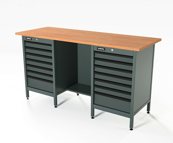 Верстак серии Standart, 1600 мм, фанера, тумба с 7-ю ящиками + тумба с 7-ю ящиками, серый RAL 7016, RUNTEC, RTS16F-TS7-TS7-7016