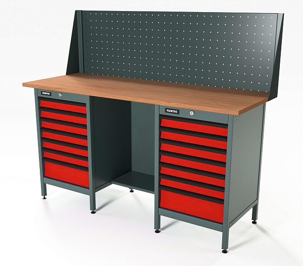 Верстак серии Standart, 1600 мм, фанера, тумба с 7-ю ящиками + тумба с 7-ю ящиками, экран 500, красный RAL 3020