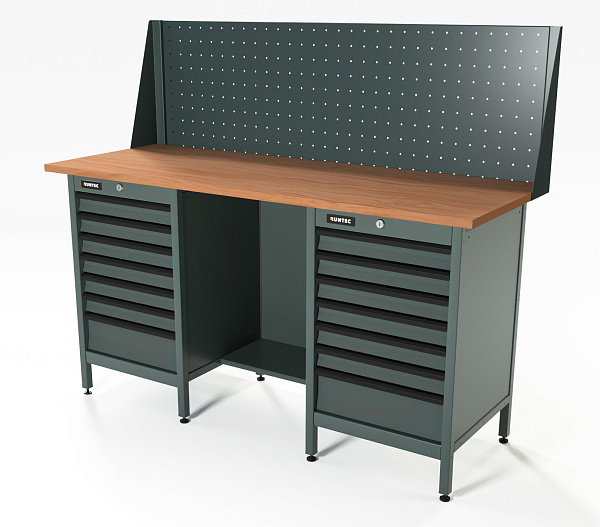Верстак серии Standart, 1600 мм, фанера, тумба с 7-ю ящиками + тумба с 7-ю ящиками, экран 500, серый RAL 7016