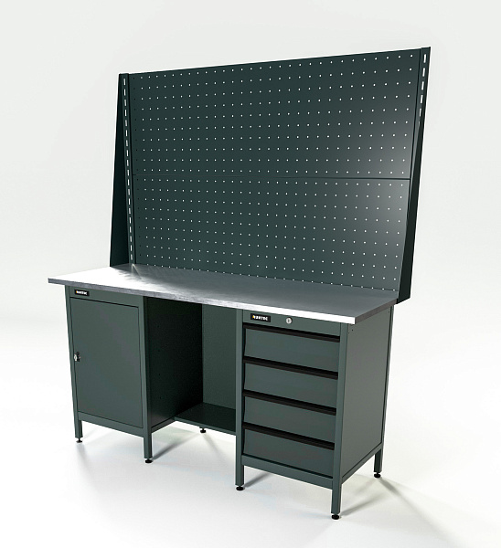 Верстак серии Standart, 1600 мм, оцинк, тумба с дверью + тумба с 4-мя ящиками, экран 1000, серый RAL 7016