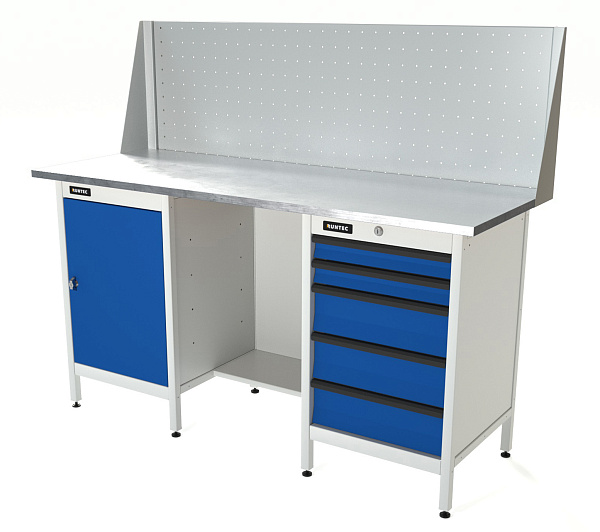 Верстак серии Standart, 1600 мм, оцинк, тумба с дверью + тумба с 5-ю ящиками, экран 500, синий (светло-серый) RAL 5005 (, RUNTEC, RTS16Z-TS0-TS5-P16-5005(7035)