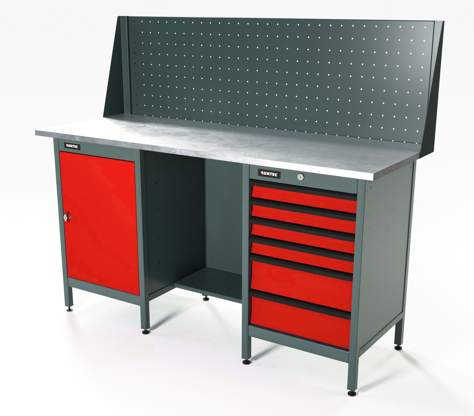 Верстак серии Standart, 1600 мм, оцинк, тумба с дверью + тумба с 6-ю ящиками, экран 500, красный RAL 3020