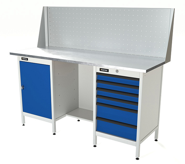 Верстак серии Standart, 1600 мм, оцинк, тумба с дверью + тумба с 6-ю ящиками, экран 500, синий (светло-серый) RAL 5005 (