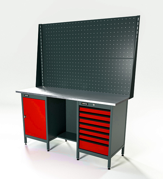 Верстак серии Standart, 1600 мм, оцинк, тумба с дверью + тумба с 7-ю ящиками, экран 1000, красный RAL 3020