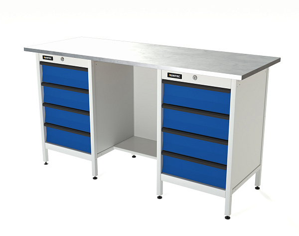 Верстак серии Standart, 1600 мм, оцинк, тумба с 4-мя ящиками + тумба с 4-мя ящиками, синий (светло-серый) RAL 5005 (7035