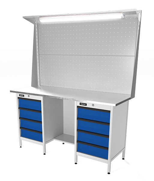 Верстак серии Standart, 1600 мм, оцинк, тумба с 4-мя ящиками + тумба с 4-мя ящиками, экран 1000, синий (светло-серый) RA