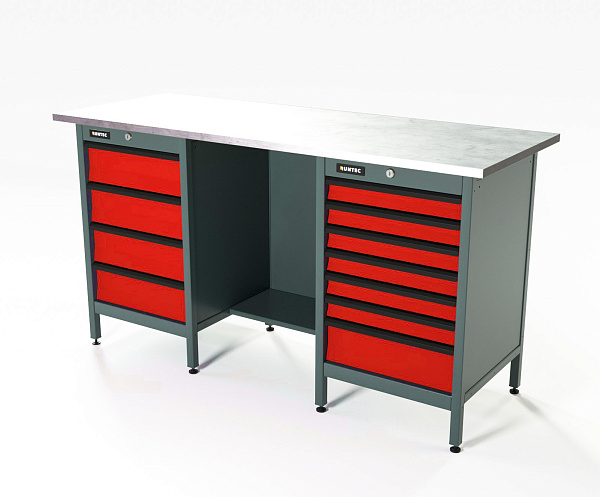 Верстак серии Standart, 1600 мм, оцинк, тумба с 4-мя ящиками + тумба с 7-ю ящиками, красный RAL 3020