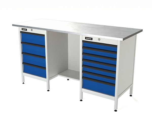 Верстак серии Standart, 1600 мм, оцинк, тумба с 4-мя ящиками + тумба с 7-ю ящиками, синий (светло-серый) RAL 5005 (7035)