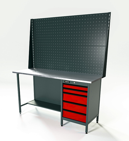 Верстак серии Standart, 1600 мм, оцинк, тумба с 5-ю ящиками, экран 1000, красный RAL 3020, RUNTEC, RTS16Z-TS5-NS-P16-P16-3020
