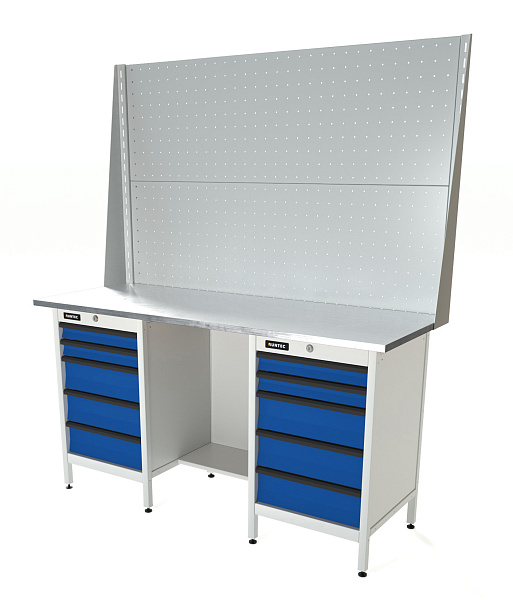 Верстак серии Standart, 1600 мм, оцинк, тумба с 5-ю ящиками + тумба с 5-ю ящиками, экран 1000, синий (светло-серый) RAL