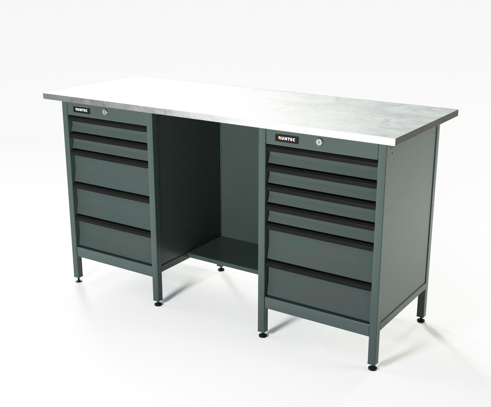 Верстак серии Standart, 1600 мм, оцинк, тумба с 5-ю ящиками + тумба с 6-ю ящиками, серый RAL 7016