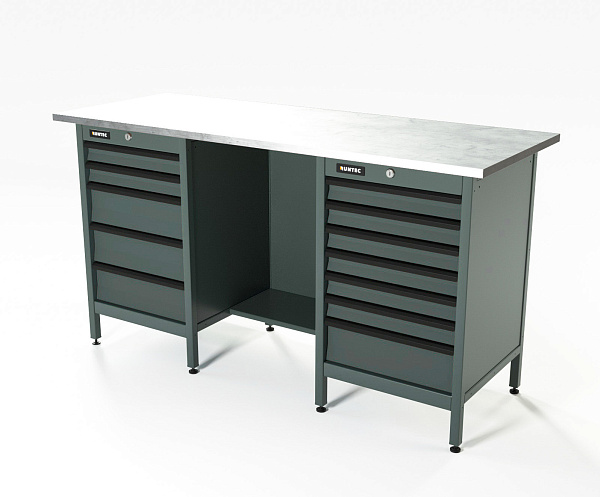 Верстак серии Standart, 1600 мм, оцинк, тумба с 5-ю ящиками + тумба с 7-ю ящиками, серый RAL 7016