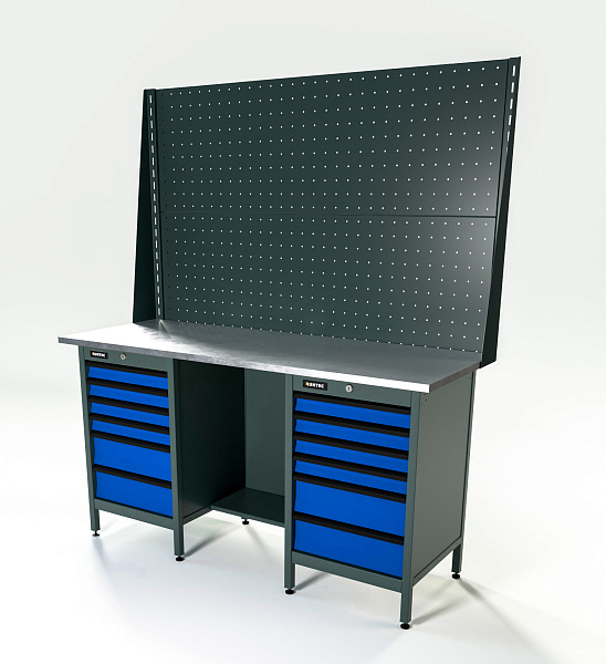 Верстак серии Standart, 1600 мм, оцинк, тумба с 6-ю ящиками + тумба с 6-ю ящиками, экран 1000, синий RAL 5005, RUNTEC, RTS16Z-TS6-TS6-P16-P16-5005