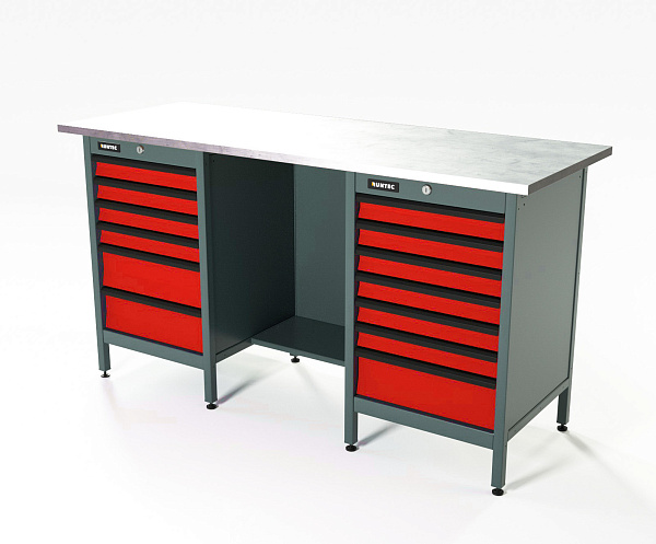 Верстак серии Standart, 1600 мм, оцинк, тумба с 6-ю ящиками + тумба с 7-ю ящиками, красный RAL 3020