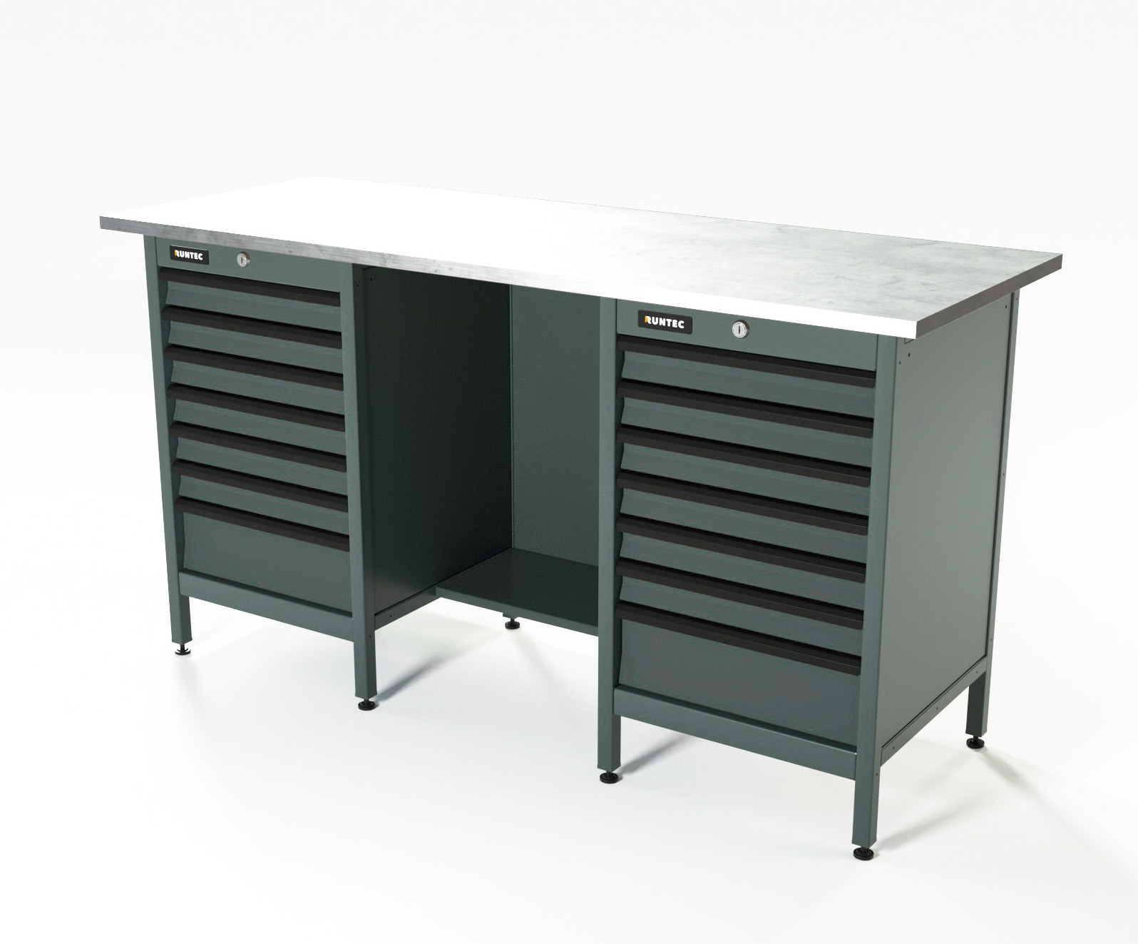Верстак серии Standart, 1600 мм, оцинк, тумба с 7-ю ящиками + тумба с 7-ю ящиками, серый RAL 7016