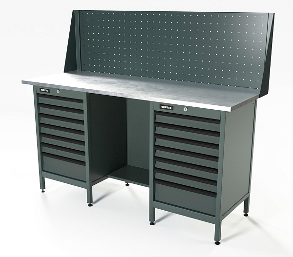 Верстак серии Standart, 1600 мм, оцинк, тумба с 7-ю ящиками + тумба с 7-ю ящиками, экран 500, серый RAL 7016, RUNTEC, RTS16Z-TS7-TS7-P16-7016