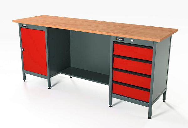 Верстак серии Standart, 2000 мм, фанера, тумба с дверью + тумба с 4-мя ящиками, красный RAL 3020