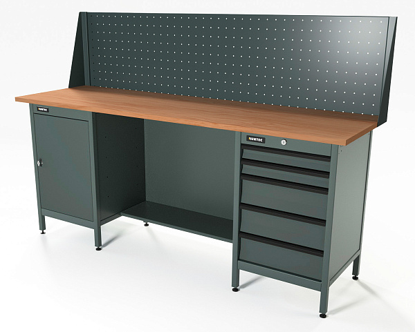 Верстак серии Standart, 2000 мм, фанера, тумба с дверью + тумба с 5-ю ящиками, экран 500, серый RAL 7016