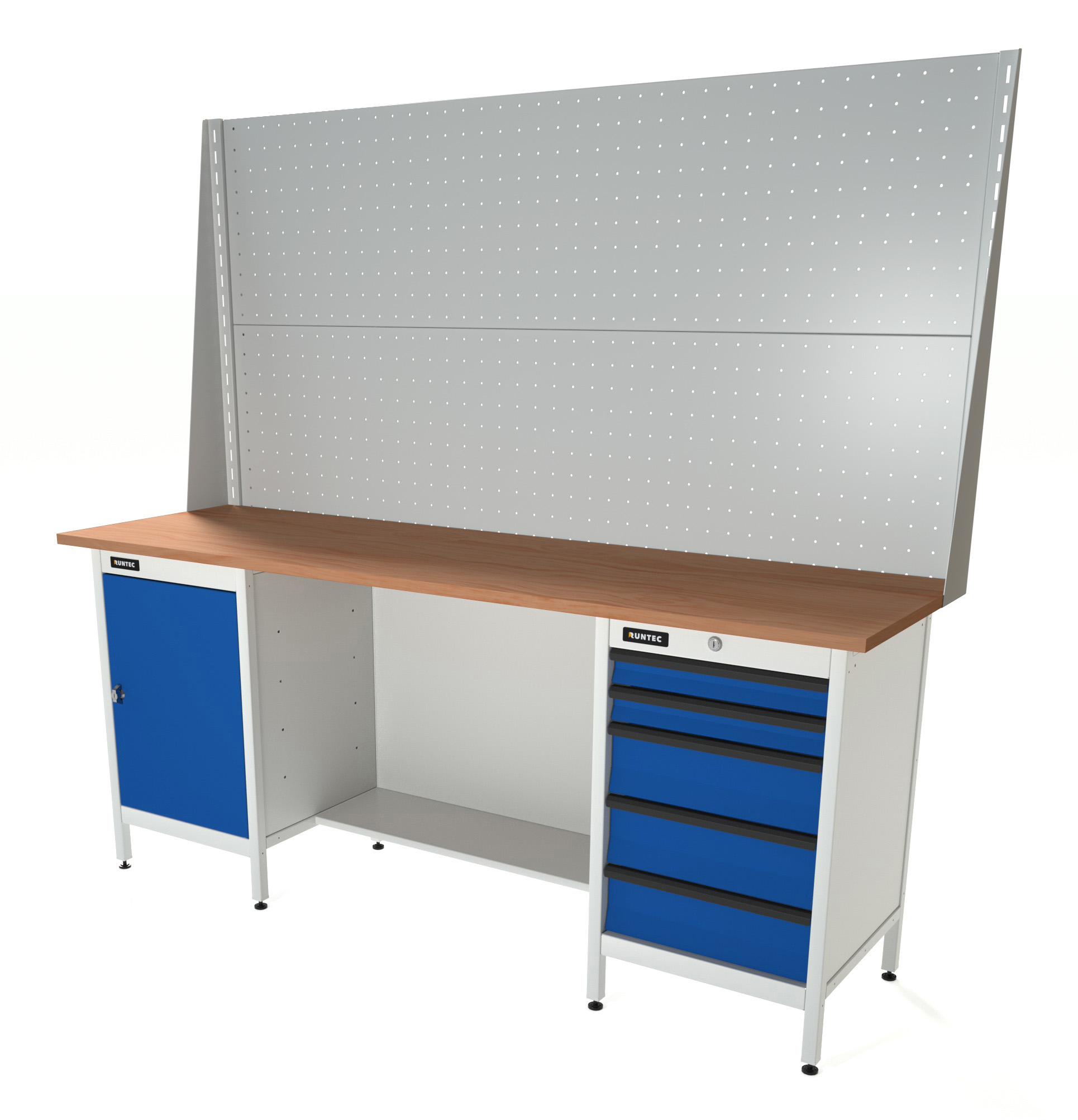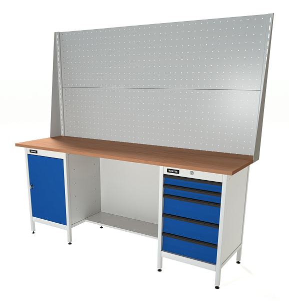Верстак серии Standart, 2000 мм, фанера, тумба с дверью + тумба с 5-ю ящиками, экран 1000, синий (светло-серый) RAL 5005
