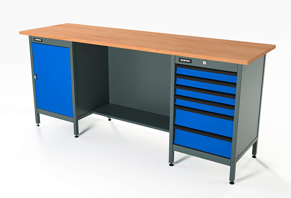 Верстак серии Standart, 2000 мм, фанера, тумба с дверью + тумба с 6-ю ящиками, синий RAL 5005