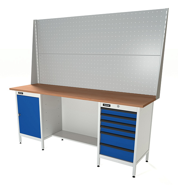 Верстак серии Standart, 2000 мм, фанера, тумба с дверью + тумба с 6-ю ящиками, экран 1000, синий (светло-серый) RAL 5005