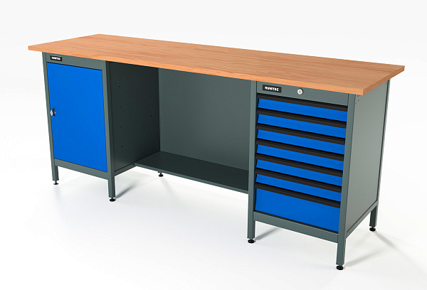 Верстак серии Standart, 2000 мм, фанера, тумба с дверью + тумба с 7-ю ящиками, синий RAL 5005