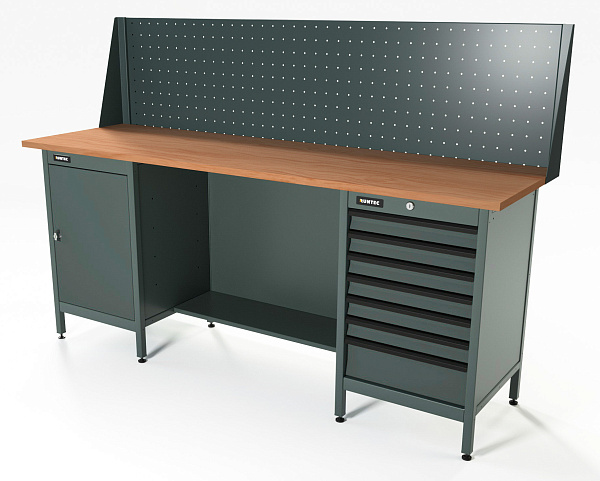 Верстак серии Standart, 2000 мм, фанера, тумба с дверью + тумба с 7-ю ящиками, экран 500, серый RAL 7016