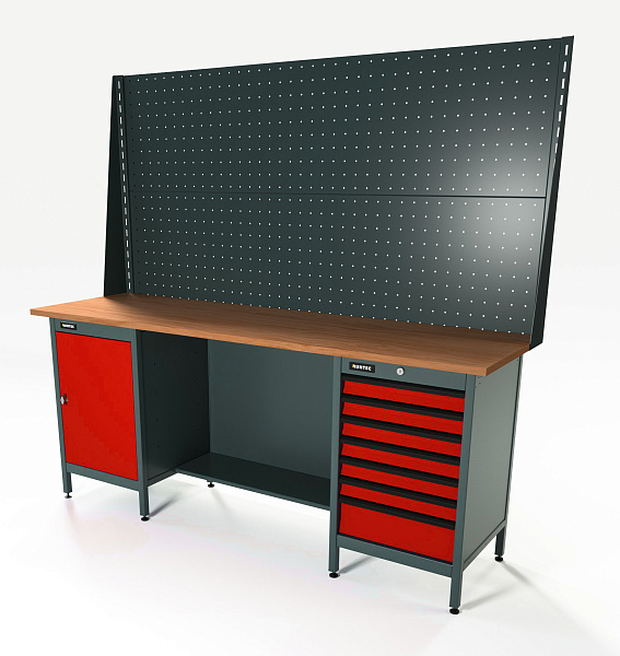 Верстак серии Standart, 2000 мм, фанера, тумба с дверью + тумба с 7-ю ящиками, экран 1000, красный RAL 3020