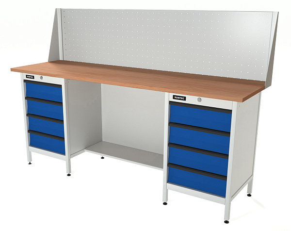 Верстак серии Standart, 2000 мм, фанера, тумба с 4-мя ящиками + тумба с 4-мя ящиками, экран 500, синий (светло-серый) RA
