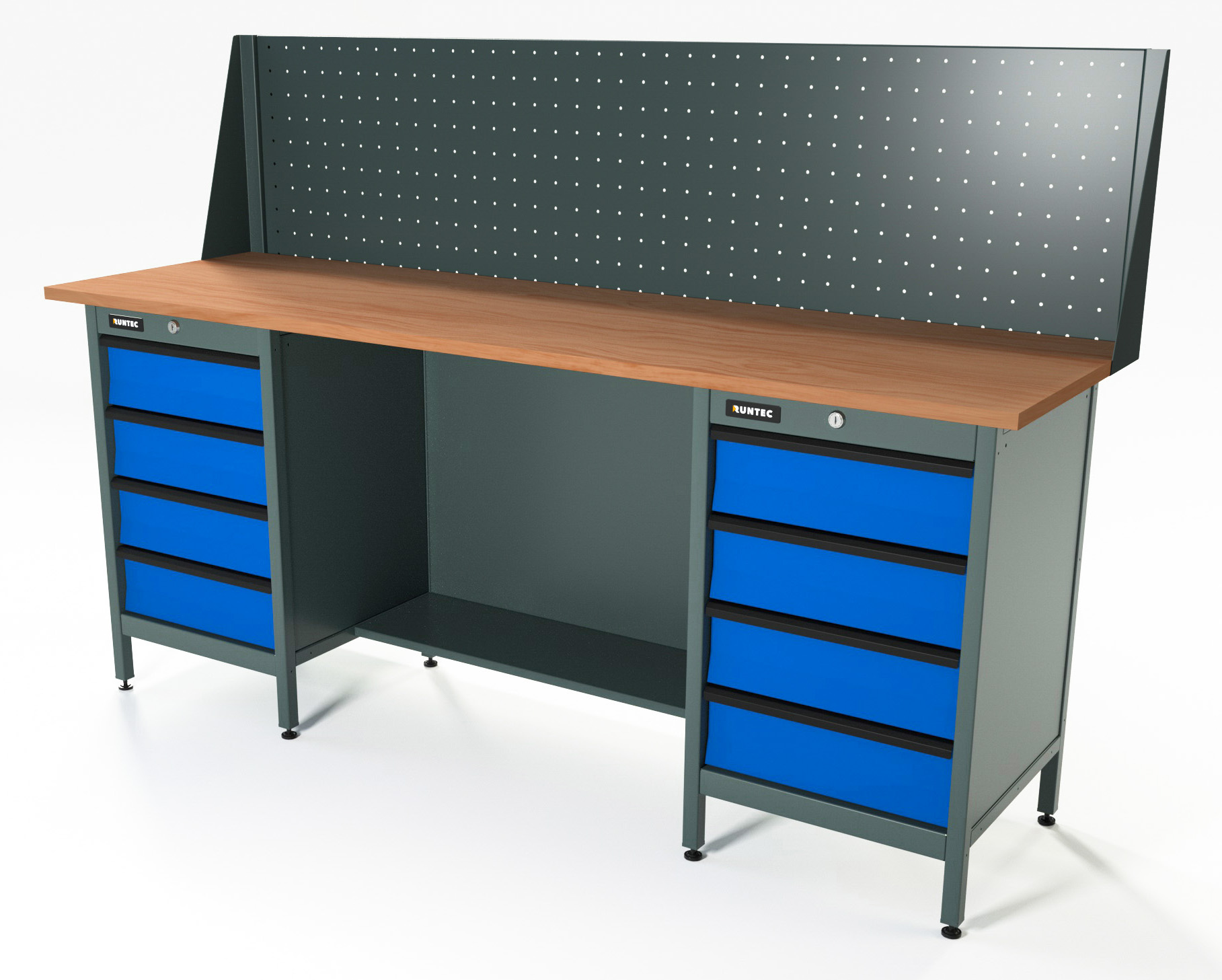 Верстак серии Standart, 2000 мм, фанера, тумба с 4-мя ящиками + тумба с 4-мя ящиками, экран 500, синий RAL 5005