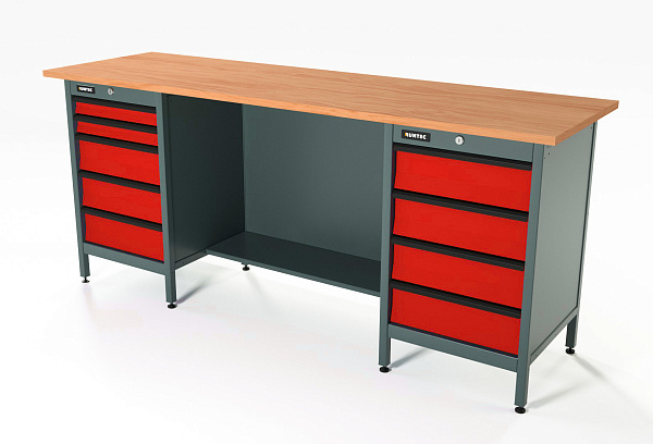Верстак серии Standart, 2000 мм, фанера, тумба с 4-мя ящиками + тумба с 5-ю ящиками, красный RAL 3020, RUNTEC, RTS20F-TS4-TS5-3020