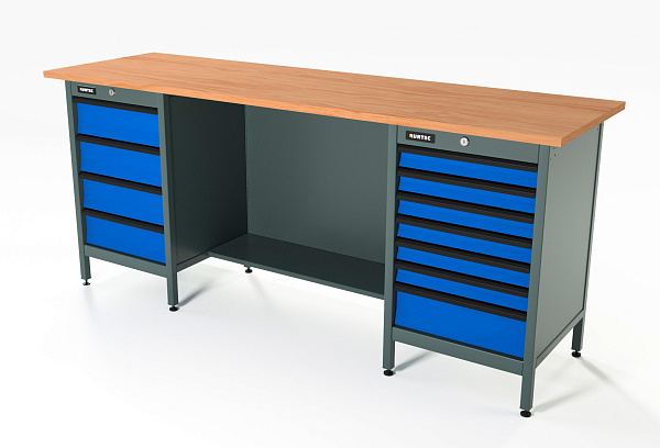 Верстак серии Standart, 2000 мм, фанера, тумба с 4-мя ящиками + тумба с 7-ю ящиками, синий RAL 5005, RUNTEC, RTS20F-TS4-TS7-5005