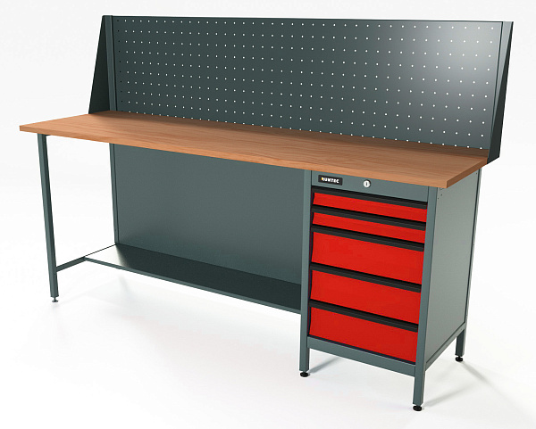 Верстак серии Standart, 2000 мм, фанера, тумба с 5-ю ящиками, экран 500, красный RAL 3020, RUNTEC, RTS20F-TS5-NS-P20-3020