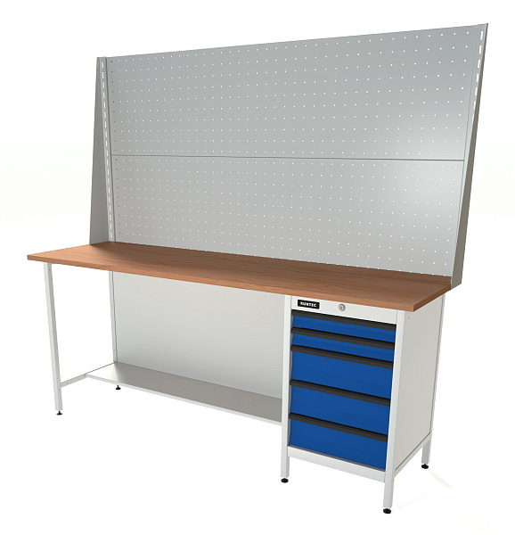 Верстак серии Standart, 2000 мм, фанера, тумба с 5-ю ящиками, экран 1000, синий (светло-серый) RAL 5005 (7035)