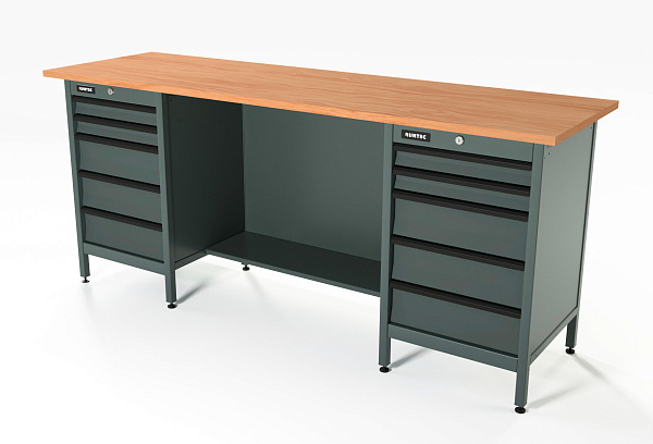 Верстак серии Standart, 2000 мм, фанера, тумба с 5-ю ящиками + тумба с 5-ю ящиками, серый RAL 7016, RUNTEC, RTS20F-TS5-TS5-7016