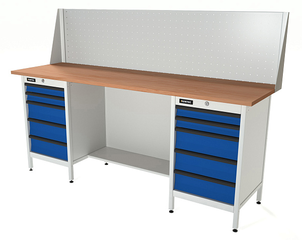 Верстак серии Standart, 2000 мм, фанера, тумба с 5-ю ящиками + тумба с 5-ю ящиками, экран 500, синий (светло-серый) RAL