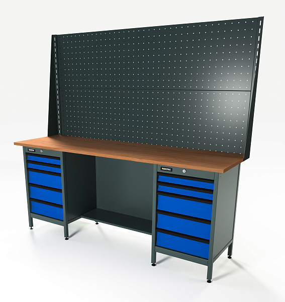 Верстак серии Standart, 2000 мм, фанера, тумба с 5-ю ящиками + тумба с 5-ю ящиками, экран 1000, синий RAL 5005