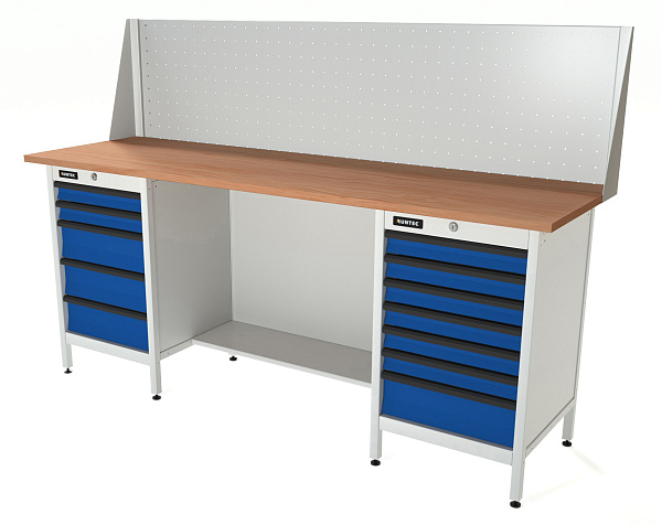 Верстак серии Standart, 2000 мм, фанера, тумба с 5-ю ящиками + тумба с 7-ю ящиками, экран 500, синий (светло-серый) RAL