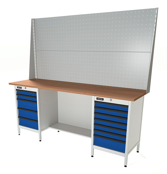 Верстак серии Standart, 2000 мм, фанера, тумба с 5-ю ящиками + тумба с 7-ю ящиками, экран 1000, синий (светло-серый) RAL