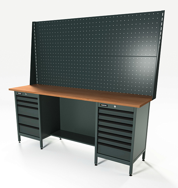 Верстак серии Standart, 2000 мм, фанера, тумба с 5-ю ящиками + тумба с 7-ю ящиками, экран 1000, серый RAL 7016, RUNTEC, RTS20F-TS5-TS7-P20-P20-7016