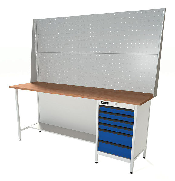 Верстак серии Standart, 2000 мм, фанера, тумба с 6-ю ящиками, экран 1000, синий (светло-серый) RAL 5005 (7035), RUNTEC, RTS20F-TS6-NS-P20-P20-5005(7035)