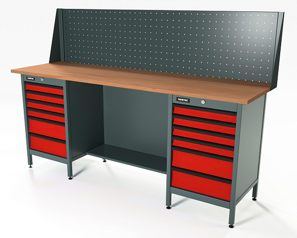 Верстак серии Standart, 2000 мм, фанера, тумба с 6-ю ящиками + тумба с 6-ю ящиками, экран 500, красный RAL 3020