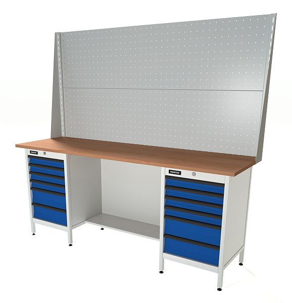 Верстак серии Standart, 2000 мм, фанера, тумба с 6-ю ящиками + тумба с 6-ю ящиками, экран 1000, синий (светло-серый) RAL