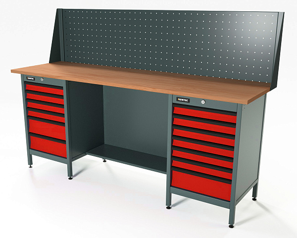 Верстак серии Standart, 2000 мм, фанера, тумба с 6-ю ящиками + тумба с 7-ю ящиками, экран 500, красный RAL 3020, RUNTEC, RTS20F-TS6-TS7-P20-3020